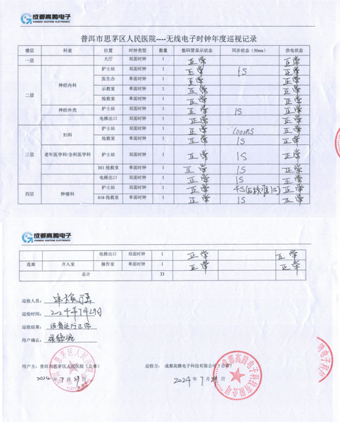 7月29日我公司項(xiàng)目負(fù)責(zé)人與普洱市思茅區(qū)人民醫(yī)院(普洱市中心醫(yī)院)信息科負(fù)責(zé)人一同對(duì)去年住院三號(hào)樓安裝的無線電子時(shí)鐘系列進(jìn)行了逐一的巡視、檢查,并形成書面記錄,形成巡視記錄檔案保存。通過此次巡視檢查,進(jìn)一步驗(yàn)證設(shè)備的無線接收性能,時(shí)間同步精度指標(biāo)是否在正常的范圍內(nèi),保證了醫(yī)護(hù)人員時(shí)刻有標(biāo)準(zhǔn)的時(shí)間信息系統(tǒng)參考。