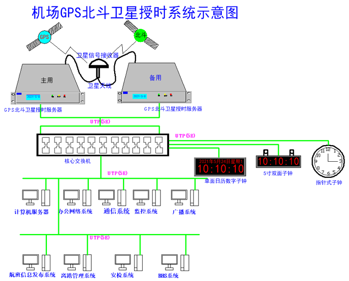 標準的時間系統(tǒng)是機場、航站樓等信息化的重要的組成部分,利用GPS/北斗衛(wèi)星時間信號為機場航站樓各業(yè)務(wù)流程和行政部門的工作有序、順利開展,提供統(tǒng)一標準、統(tǒng)一的時間信息,意義重大,其主要作用:
